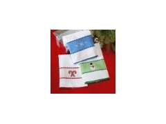 Waffle-weave cotton kitchen towels are stitched in festive designs trimmed with rickrack. Machine wash. 14" x 20".
