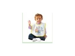 Adorable, white cotton terrycloth bib, trimmed in sunny yellow with spill-proof back and a snap closure. Machine wash, made in the USA. 11" x 15".